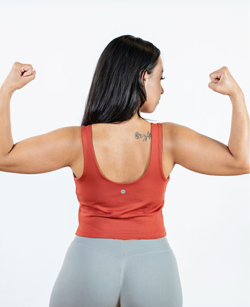Cloud support cropped tank complete with built-in bra for convenience and support.